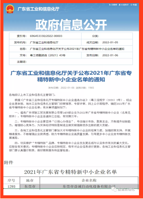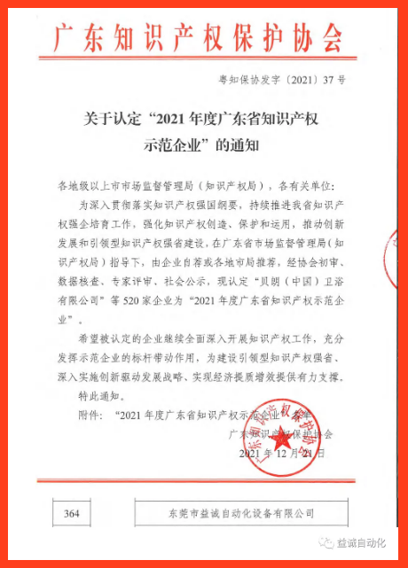 【喜报】祝贺益诚自动化荣获“2021年广东省专精特新中小企业”和“2021年度广东省知识产权示范企业”称号